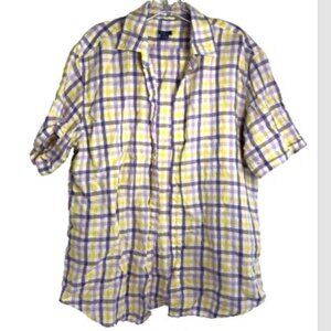 Tom James mens button linen shirt large purple white yellow plaid check gingham