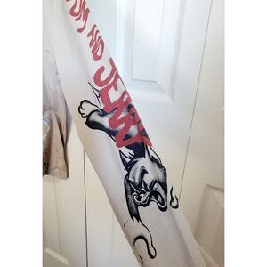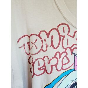 The shirt is a unisex adult size 2XL and has a regular fit. It is designed to stretch and has a crew neckline. The shirt is beige in color and has a graffiti print of Tom & Jerry. It is a great addition to any fan's wardrobe and makes a perfect gift.