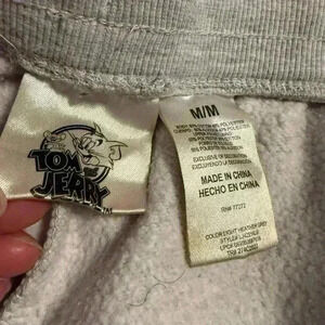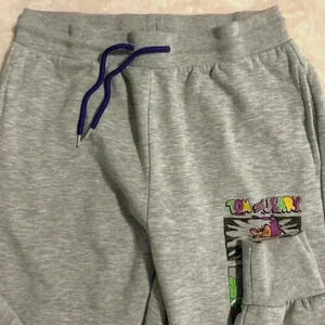 Tom & Jerry Juniors Joggers with drawstring elastic waist front side pockets in gray with graphics on left leg. Women’s size Medium. 60% cotton 40% polyester length 36” SFPF HOME