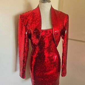 Tom & Linda Platt Vtg. Ruby Red Sequin 2 pc. Tank Dress & Bolero Jkt, S, Amazing