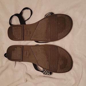 A slight bit of wear on the soles and straps. Black and white straps. Brown base