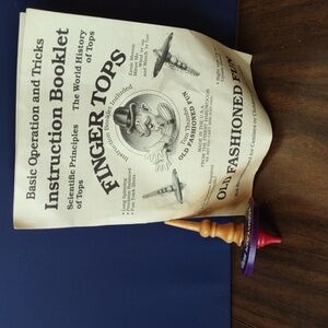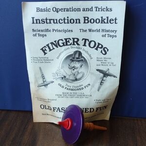 This image shows a Tom Thumbs Finger Tops toy with its instruction booklet, highlighting its old-fashioned fun and scientific principles.