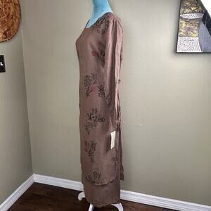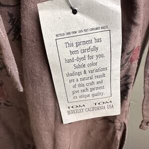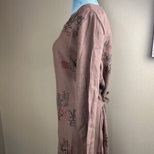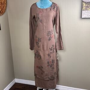 Tom Tom Linen Asian inspired long casual wear Canton Tea Dress NEW with Tags in women’s very relaxed Medium. Beautiful light rich coco brown in rough woven linen that’s machine washable ! Pretty calligraphy print over entire dress. Rough woven linen has a unique texture giving it a variation in weave, color and surface-texture creating a beautiful easy hippie look. The waist ties allow the wearer to custom fit this beautiful easy two tier dress for a beautiful silhouette :). Sides have vertical slits accentuating the tiered bottom of the dress and allowing the dress to move beautifully with the wearer. My FLAT measurements are: chest (axilla to axilla) 21”, waist (at the point of ties) 22”, arm 24”, length at first tier 43.5” and second 50.5” . Thank you so much for your consideration of this New with Tags unique and beautiful canton tea dress from Tom Tom !!