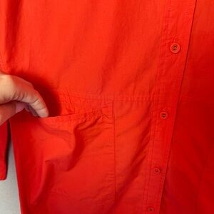 tomas maier x uniqlo, red orange kaftan dress, cotton poplin dress, size S, button-up shirt dress, mandarin collar, pockets dress, lagenlook, boxy fit, boho resort wear, summer cotton dress, breathable shirtdress, minimalist look, vacation dress, artwear dress