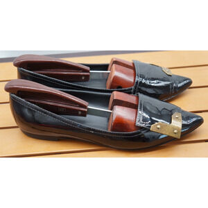 The product is a pair of Tomas Maier pointy patent leather ballet flats in a size US 7.5, UK 6.5. These stylish shoes are designed for women and are perfect for casual occasions. Made in Italy, the black flats feature a slip-on closure and a comfortable M width. With their solid pattern and ankle strap details, these ballet flats are a chic and versatile addition to any wardrobe, ideal for wearing during the seasons of summer, fall, and spring.