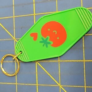 Brighten your day with this charming tomato keychain. Featuring a vibrant green and red design, it's perfect for adding a touch of fun to your accessories.
