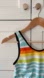 Features: tonal, rainbow striping, black trim, white, teal, green, yellow striping, B&W, stretchy, pool party, summer, beach separates, travel, resortwear, gender neutral, unisex styling, classic contemporary, maximalist, pride, funky, fun, indie sleeze, everyday styling