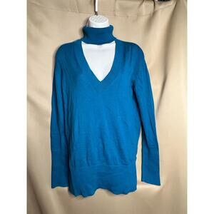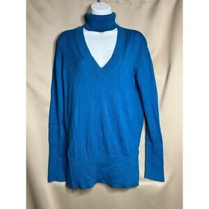 Blue wool knit sweater. 100% merino wool. Long sleeve. Turtleneck with V cutout. 29” from shoulder to hemline.