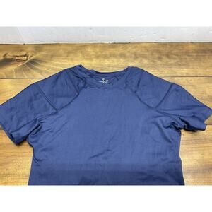 This Tommie Copper Shirt is a women's size Large in a stylish blue color. It features a crew neck neckline and short sleeves, perfect for casual or activewear occasions. The fabric blend of nylon and spandex provides a lightweight, stretchy, and breathable feel, with quick-dry and easy care properties. The shirt offers shoulder-centric support and compression, ideal for activities like gym training, yoga, and running. The design includes a pullover closure and is part of the Core Support Compression product line, emphasizing its performance and outdoor theme.pre owned good condition we ship fast measurements are In the pictures