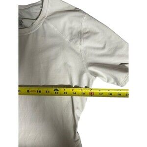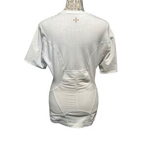 The Tommie Copper Shirt is a women's medium crew performance short sleeve top in white. It features a crew neck, pullover closure, and is made of lightweight and breathable nylon and spandex material. This sporty activewear top is designed for comfort and support, with a focus on the waist, back, and body areas. The shirt is ideal for summer, fall, and spring seasons, and showcases a solid color pattern with a classic outdoor sports theme. Easy to care for with machine washable instructions, the Tommie Copper Shirt from the Copper Znergy product line is a stylish and practical choice for active women.