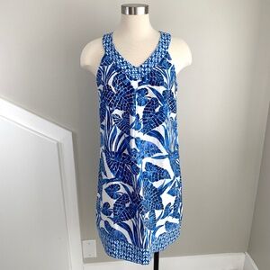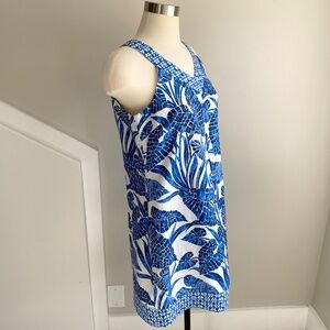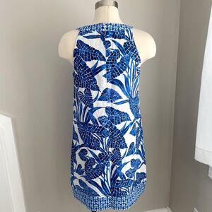 Tommy Bahama 100% linen shift dress with a gorgeous blue and white batik style mosaic palm print. Fully lined in 100% cotton. Full back zip, gather detail at front. Excellent used condition, no flaws.