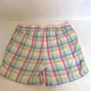 Tommy Bahama Women's Small Pull On Colorful Plaid 100% Linen Beach Summer Shorts are high-rise, breezy linen shorts with a drawstring waistband and vibrant summery hues. They have a 5 inch inseam and are made of 100% linen! Front pockets. Shorts are in great used condition.