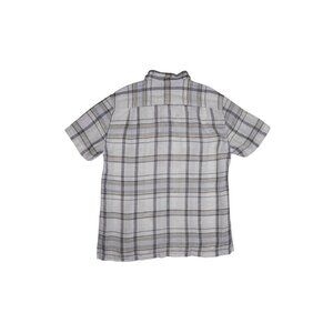 Tommy Bahama men’s short sleeve button-down shirt in size large. Made from 100% linen, offering a lightweight and breathable feel perfect for warm weather. Features a neutral plaid pattern in shades of gray, white, and blue. Single chest pocket and button-front closure.