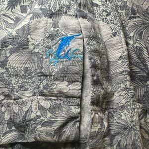 Crafted for comfort and style, this Tommy Bahama men's silk button-up shirt is a versatile addition to any wardrobe. Its soft, woven silk fabric ensures a luxurious feel with the ease of care that travelers will appreciate. The shirt features a spread collar neckline and convenient button closure, making it an ideal choice for casual outings, cocktail parties, or while out on the town. The shirt's striking gray floral Hawaiian surf theme captures the essence of beach and Aloha spirit, while the short sleeves and lightweight material offer comfort across all seasons. With practical pockets and a chest size of 48 inches, this regular fit, size large garment is both functional and fashionable. 24" pit to pit and 29" length. Excellent condition. No rips/holes/tears/excessive stretching/stains/discoloration/snags. Kept in a smoke/pet free home.