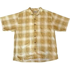 Tommy Bahama 100% Silk Camp Shirt Polo Yellow Beige Plaid Short Sleeve Button