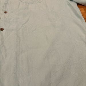 Tommy Bahama 100% Silk Light Green Mint Palm Leaves Short Sleeve Button Down. 1 pocket. Collared. Tropical. Armpit to armpit 29 1/2 inches. Length 32 1/2 inches. Size XXL. Great condition!