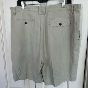 These Tommy Bahama men's shorts are made of 100% silk in an ivory color, featuring a relaxed fit with a pleated front and a zip closure. They have a Bermuda style with a high rise waist, a size 38 waist, and an 8-inch inseam. Ideal for travel, casual wear, or outdoor activities in summer, fall, or spring, they also include pockets for added convenience.