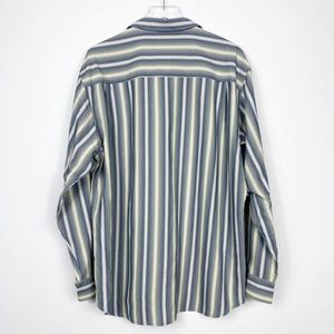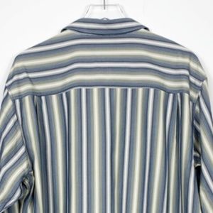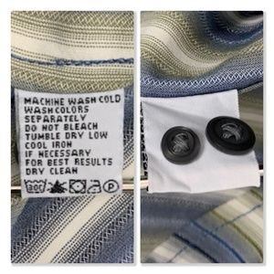 Tommy Bahama striped long sleeve button down shirt. Blues, greens & cream. Left breast pocket. Hidden button down collar. Adjustable mitered cuffs. Curved hem. 100% silk. Extra buttons on back of care tag. In excellent condition.