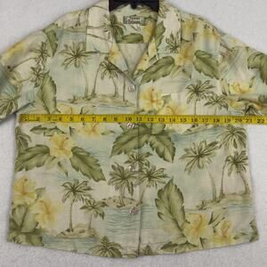 This authentic Tommy Bahama women’s silk camp shirt in size Medium (8/10) features a serene tropical island scene with palm trees, hibiscus flowers, and ocean hues of green, yellow, and blue. Made from 100% silk for a soft, lightweight feel, it offers a relaxed resort fit with short sleeves, a camp collar, and button front closure. Perfect for vacations, beach getaways, or everyday wear with effortless island style. Gently preowned and well cared for, this shirt brings signature Tommy Bahama comfort and luxury to any wardrobe. RN 86543 guarantees authenticity.