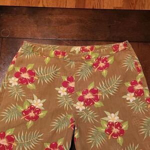 Lovely textured silk cropped pants printed in a lovely tropical floral pattern. Concealed zipper and hook & eye closure on the side.