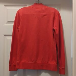 Excellent used condition Tommy Bahama sweatshirt in a beautiful orange red, with a pink interior. Does not have a tag, but the measurements match that of a small. Such a fun and colorful way to keep warm on the chilly nights!
