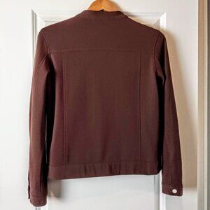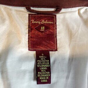 Fully-lined zip-front jacket with two side pockets, one interior pocket, snap closures at neck and cuffs from Tommy Bahama in a rich chocolate brown and cream trim.