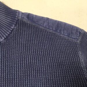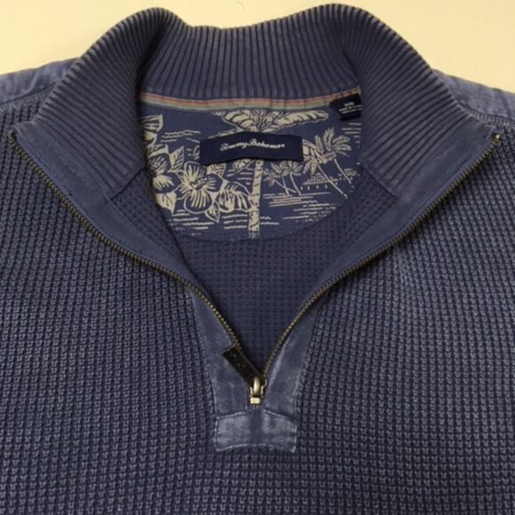Tommy Bahama 3XB blue cotton long sleeve half-zip sweater. Soft cotton knit on the body and arms with contrasting cotton fabric on the shoulder and around the metal zip that features the marlin logo. Color variation gives it a comfy faded denim look. 100% cotton is machine washable.