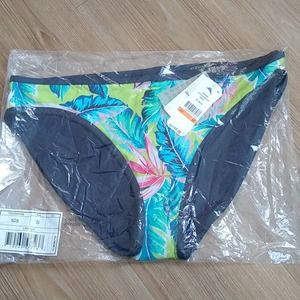 Take a dip in these bright palm-print bikini bottoms made from compression fabric in a sporty hipster shape. Solid navy on the reverse side.