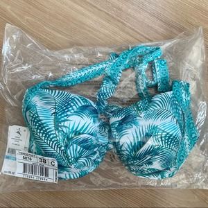 This halter-style underwire bikini top features pretty jade fronds in a supportive, feminine shape.