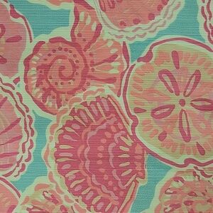 Charming dress with aqua and coral shell design from Tommy Bahama. Girl's sz 6. back zipper. 100% cotton, lined with 80/20 poly/cotton