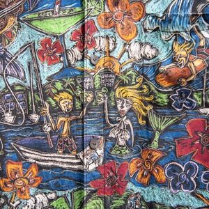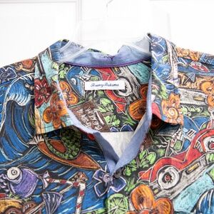 Amazing 100% Silk Tommy Bahama button down shirt. Bright and Colorful "Hawaiian Shirt" in Limited Artist Series Shirt Segel Cali Coast all over print. This shirt is a mens XXL in great pre-owned condition! Colors are still vibrant and texture feels great! If you love making a statement with funky and wild shirts, this is the shirt for you!