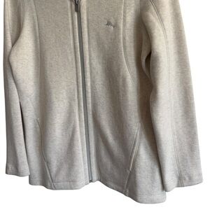 Cozy full-zip jacket from Tommy Bahama in a light beige/oatmeal color. Size Small and in great preowned condition; no visible flaws.