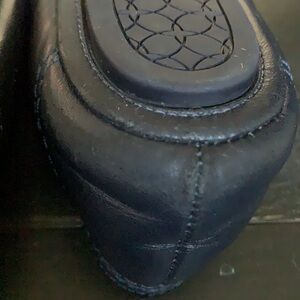 Soft leather upper and lining, with a rubber grip sole and lightly padded footbed. Slip on style featuring a metal leaf toe detail. Round toe. Used but still in great condition. The leather on underside of heel is scratched up common in my flats but you don’t see it when wearing. And some wrinkling in the leather body again that’s natural with soft leather.