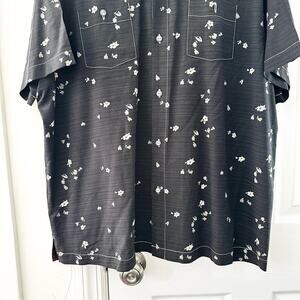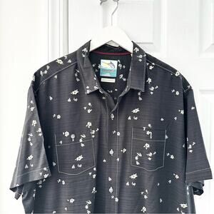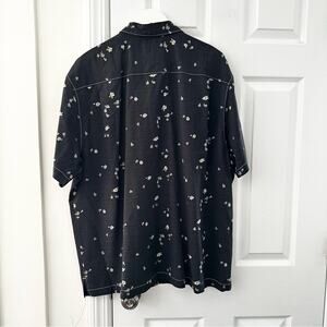 Size XLX from Tommy Bahama. Black with with floral print silk and cotton blend button down shirt. Short sleeve. Island modern fit. Contrast white stitching and two front patch pockets on chest. Preowned in good condition with no stains or tears.