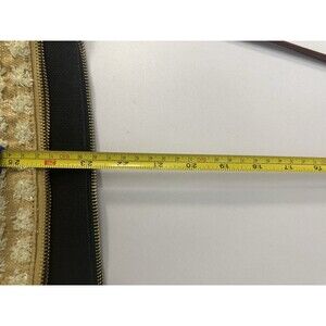 The Tommy Bahama Black Linen Crossbody Bag is a stylish medium-sized shoulder bag perfect for travel, parties, or casual outings. The square-shaped bag features a black and beige exterior with gold-plated hardware accents. It has a zip closure, brown faux leather crossbody strap, and lined interior with inner and outer pockets for organization. The lightweight knit bag also includes a detachable strap for added versatility. Perfect for the fashion-forward woman who values both convenience and style in her accessories. Excellent condition!