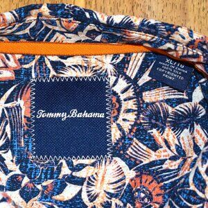 Short sleeve button front shirt by Tommy Bahama. Size XL and 100% silk. Blue with tropical floral print in white/orange In excellent used condition with no holes, tears, or stains. Comes from a smoke free home.