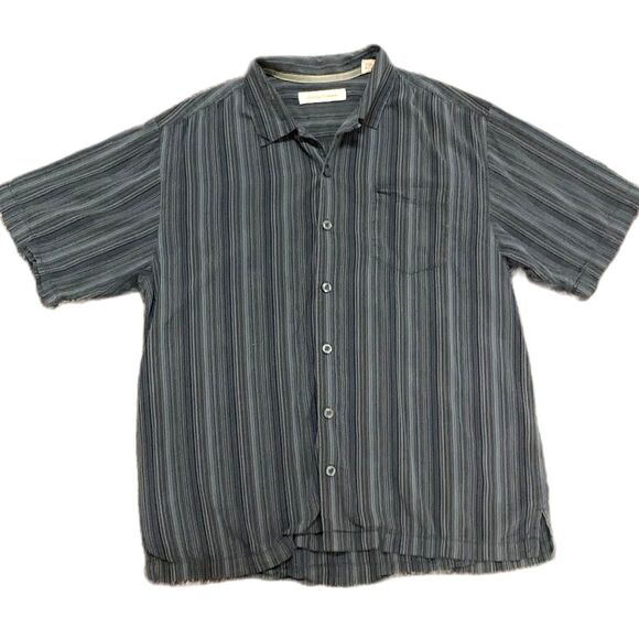Tommy Bahama Blue Gray Stripe Silk Short Sleeve Button Front Hawaiian Shirt L