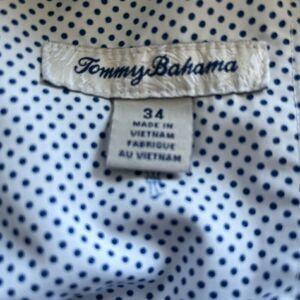 These Tommy Bahama Bermuda shorts feature zip/button closure, stretch waist, 2 hip slip pockets, 1 zip close hidden hip pocket, 2 rear slip pockets, and are in like new condition. They are 90% Polyester and 10% spandex, and the plaid is done in shades of blue, white, and peach. The size 34 has a 10" inseam, and a length of 22".
