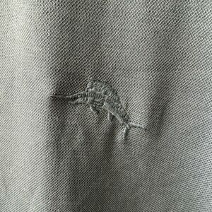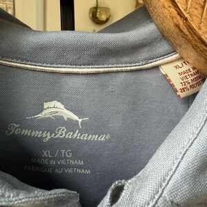 Men’s Tommy Bahama, blue modal and polyester blend golf shirt with three button placket and white contrast stitching. Mmmm Spare button on the interior tag. Embroidered tonal sailfish at the chest.. Laying flat measures 30” shoulder to hem and 24 inches armpit to armpit.