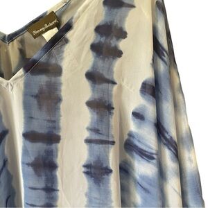 Embrace the beach vibe with this Tommy Bahama swim coverup, featuring a captivating blue tie-dye pattern. The lightweight fabric and flowy design ensure comfort, while the tassel-adorned hem adds a playful touch. Tommy Bahama Oliana Stripe Tie Dye Shift Dress. This dress features a blue and white tie-dye pattern with vertical stripes. It is made from a blend of 96% viscose and 4% spandex, offering a soft and stretchy feel. The dress is designed with a V-neck and a loose, comfortable fit, making it suitable for casual wear or beach outings. It's also wrinkle-resistant, which makes it convenient for travel.