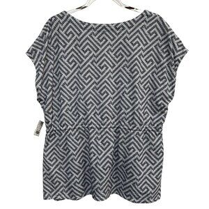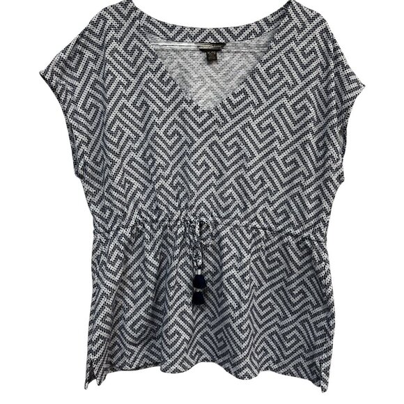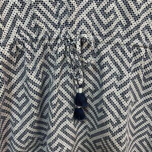 This stylish Tommy Bahama blouse features a blue and white geometric pattern and a flattering cinch waist complemented by a chic blue tassel. Perfect for adding flair to any outfit.