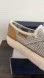Chic slip-on shoes with a bow accent. Features blue and white stripes with tan heel detail.