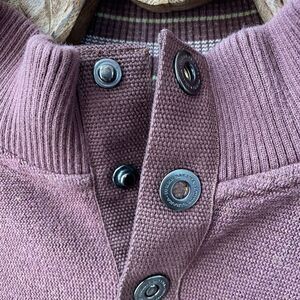 Men’s Tommy Bahama snap Henley placket 100% cotton pull over sweater with banded ribbed waist and cuff. Laying flat measures approximately 25 inches shoulder to hem and 24 inches armpit to armpit. Logo branded snaps.