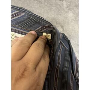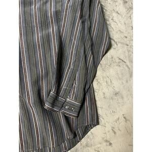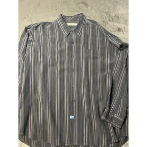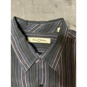 Elevate your wardrobe with this sophisticated Tommy Bahama button-up shirt in size 2XL. The striped pattern and gray color make it perfect for any occasion, whether it be a casual gathering or a business meeting. The shirt features long sleeves, a collared neckline, and a spread collar style with button accents.