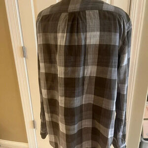 husband closet clean out! This is a very gently used men’s button-down shirt. It is a plaid pattern but a bigger square more like I don’t know gingham big squares. Lol the colors are like charcoal, gray, and blue. I tried to take a close-up picture so you can see the colors. There are no stains snags. Excellent condition as it has never been worn. I personally don’t think he wore this very much. He has too many shirts! Don’t recall what I paid for it probably 128.00 or something like that. All of my items come from a smoke-free home. The material on this is 100% cotton and the style is more of a casual shirt as the collar does not button down to the shirt itself. Offers are welcome. Thanks for stopping by.