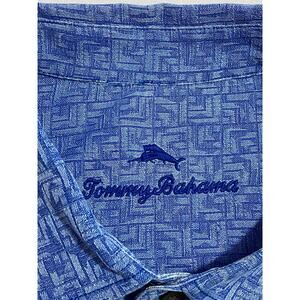Blue short-sleeve button-up shirt with subtle textured pattern — clean, versatile Tommy Bahama style Full button front with spread collar — breathable and easygoing for warm-weather wear Made from 100% silk — smooth, lightweight, and elevated for resort-ready comfort Marked XL across chest (see photo for reference) Made in China — quality construction with signature Tommy