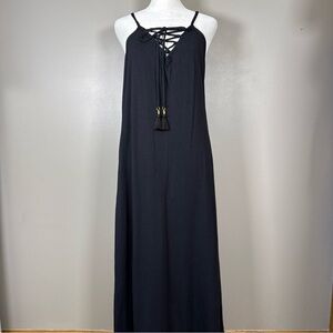 This is a Tommy Bahama black maxi dress in size medium. It is made of a cotton modal blend jersey fabric with adjustable straps and tasseled accents. The dress features a V-neckline with a lace-up closure, sleeveless design, and a layered look with a semi sheer bottom hem.