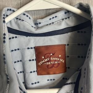 Elevate your beach style with this Tommy Bahama Denim Beach Casual Shirt for Men. This blue striped shirt features a collared neckline, long sleeves, and a button-up closure. Made with breathable, machine-washable cotton fabric, this shirt is perfect for any occasion, from travel and weddings to parties and casual outings.