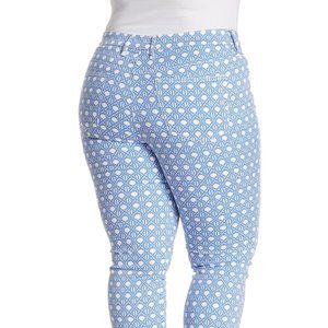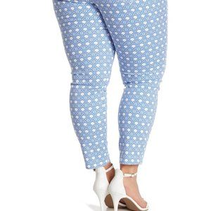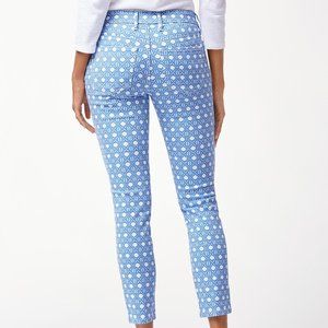 Tommy Bahama Denim NWT women's Cataline Caning skinny ankle jeans. These on-trend skinny jeans feature a geometric print in Violet Peta. Zip fly with button closure. Five pocket styling. Allover print. Belt loops. Skinny leg. Size 33R. Inseam 30", Rise 10", Waist 17" laying flat. 64% Cotton, 34% Tencel Lyocell, 2% Elastane. Machine wash cold.