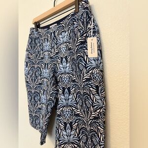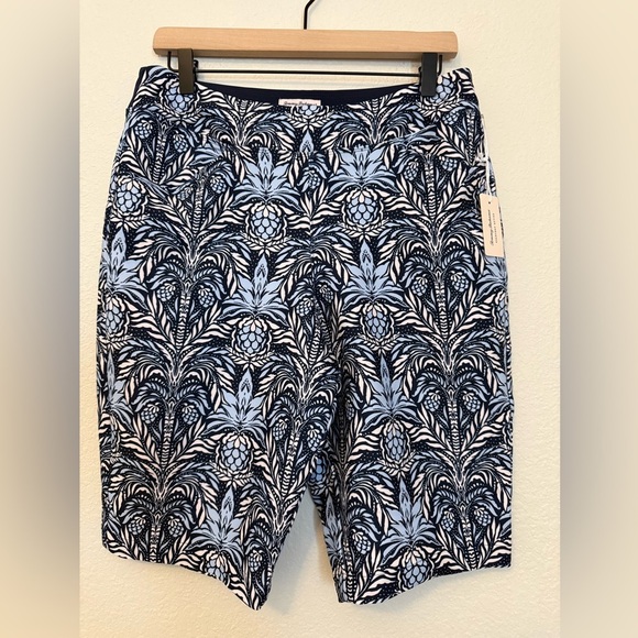 Stay cool and stylish in these Tommy Bahama Everyday Active Bermuda Shorts. Featuring a beautiful navy blue and light blue tropical pineapple leaf print, these shorts combine comfort with island-inspired style. Crafted from a soft, stretchy fabric blend, perfect for active days or casual outings.